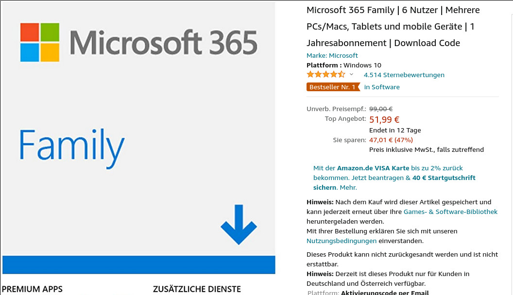 08.01.21 Derzeit kann man bei Amazon das nicht ganz unstrittige Softwarepaket Microsoft 365 für eine Einmalzahlung von 51,99 Euro statt 99,99 Euro erwerben. Dazu gibt es 1 TB an Cloud Speicher pro Nutzer. Dabei gibt es das Family Paket für 6 Nutzer. So bekommt man auf diese Weise immerhin sehr viel Cloud Speicher ohne grosse Kosten. Wir zeigen Ihnen -wie immer -alle Features des Microsoft 365 Family Paketes auf.