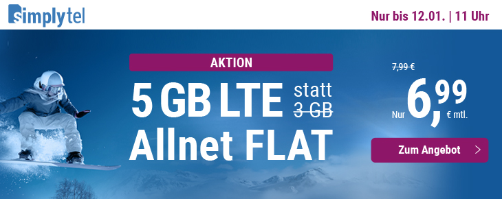 05.01.21 Beim Handydiscounter Simplytel gibt es ab sofort die Simplytel Tarife im Rahmen einer neuen Neujahr Deal Tarifaktion ab sofort verbilligt und mit mehr Datenvolumen. So gibt es den schnellen 5 GB All-In-Flat für unter 7 Euro im Monat. So zahlt man nun beim Simplytel 5 GB All-In-Flat Tarif mtl. 6,99 Euro und bekommt 2 GB Datenvolumen gratis. Die neue Tarifaktion gilt bis zum 12.Januar 11 Uhr. Wir zeigen Ihnen -wie immer- alle Features der neuen Simplytel Tarife Aktion auf.