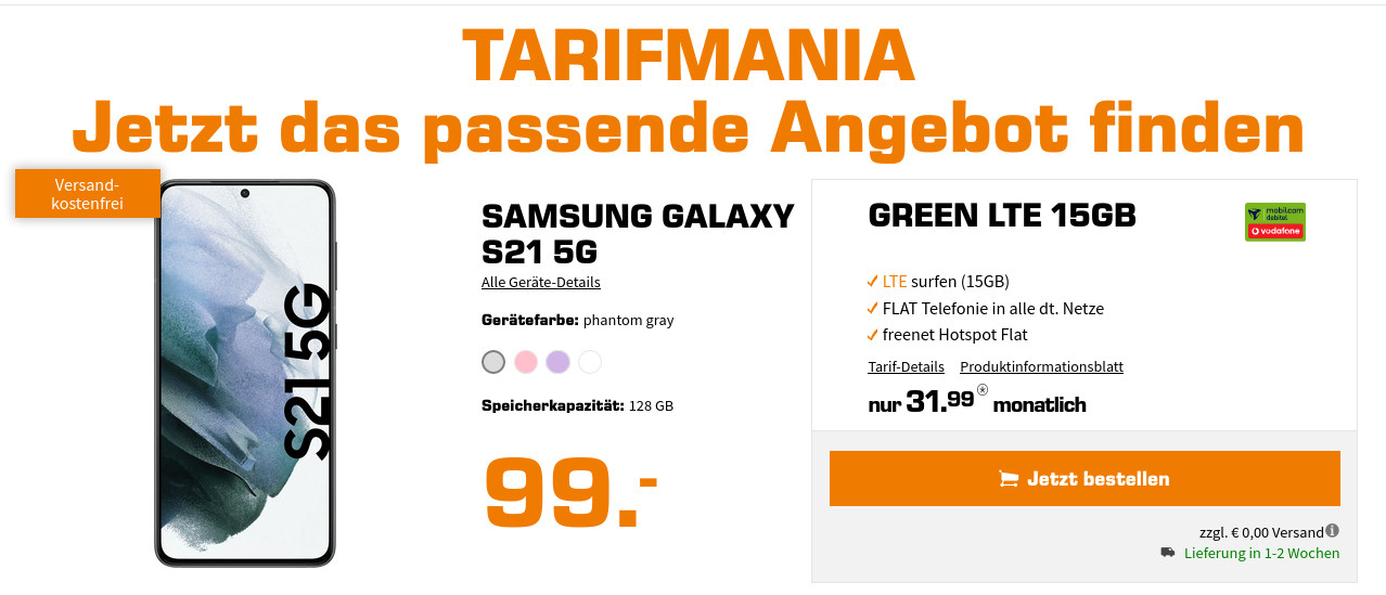 Preistipp Galaxy S21 5G: 15 GB Vodafone Allnet-Flat für mtl. 31,99 Euro/Eff. 8,61 Euro