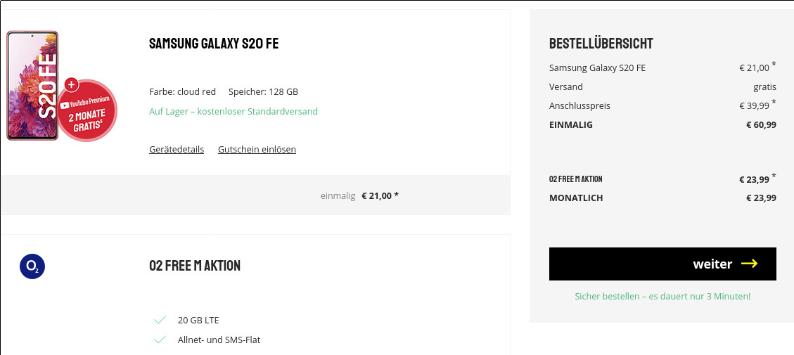 08.06.21 Ab sofort gibt es wieder neue Angebote zum neuen Samsung Galaxy S20 FE 126 GB im Wert von rund 600 Euro. So gibt es das tolle Galaxy S20 in Verbindung mit einem original o2 Blue All-in M 20 GB Tarif im O2 Netz für monatliche 23,99 Euro statt 29,99 Euro bei einem Top-Speed von 225 Mbit/s. Für das Galaxy S20 4G 128 GB werden nur einmalige 29 ...mehr