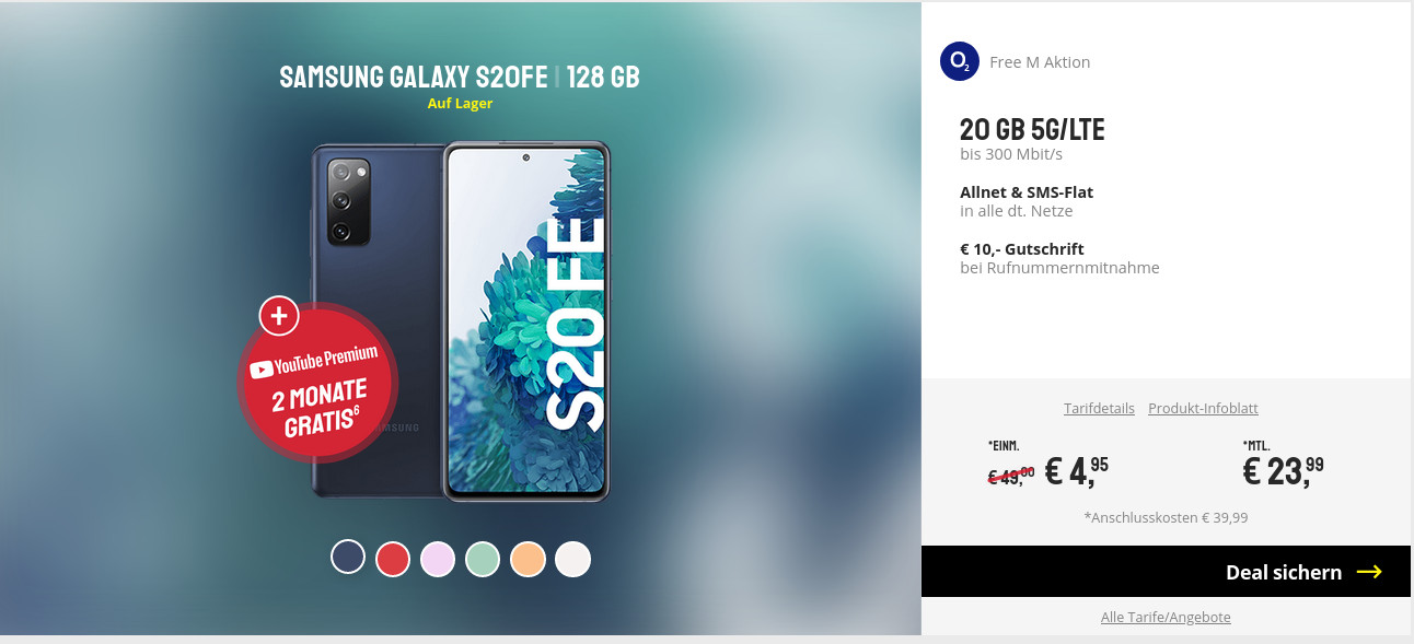 22.07.21 Auch zum langsamen Start in der Wochenende gibt es das Angebote zum neuen Samsung Galaxy S20 FE 126 GB im Wert von rund 540 Euro. So gibt es das tolle Galaxy S20 in Verbindung mit einem original o2 Blue All-in M 20 GB Tarif im O2 Netz für monatliche 23,99 Euro statt 29,99 Euro bei einem Top-Speed von 225 Mbit/s. Für das Galaxy S20 4G 128 GB werden nur einmalige 4,95 ...mehr