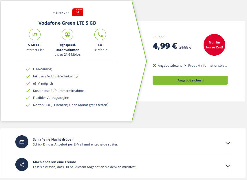 Preistipp 5 GB Vodafone LTE Tarife: 5 GB LTE Vodafone All-In-Flat für mtl. 4,99 Euro und 408 Euro sparen