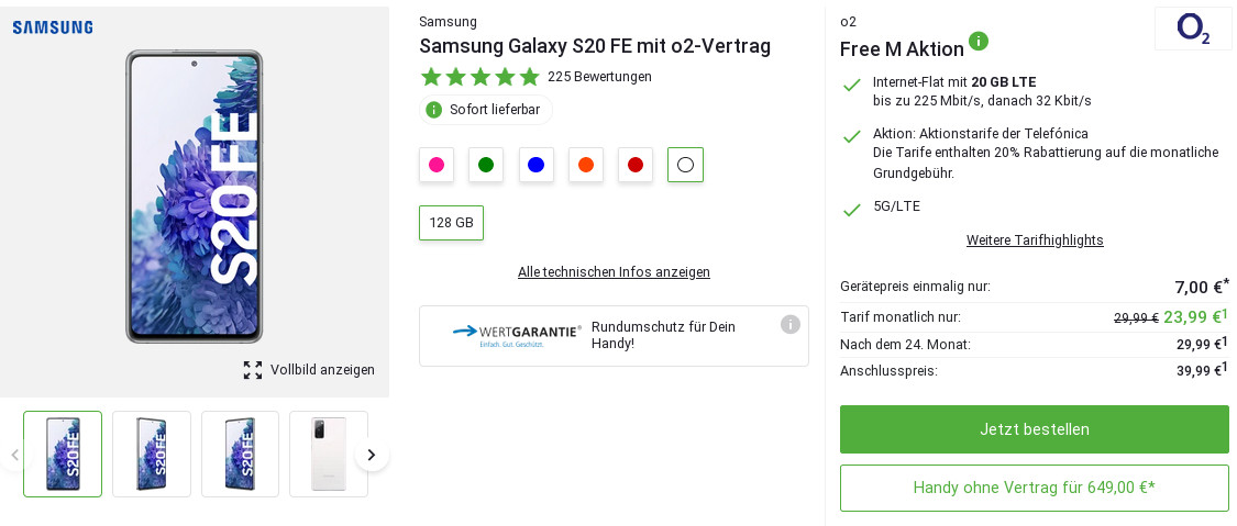 11.09.21 Zum Start in das Wochenende gibt es neue Angebote zum neuen Samsung Galaxy S20 im Wert von rund 480 Euro. So gibt es das tolle Galaxy S20 in Verbindung weiterhin mit einem original o2 Blue All-in M 20 GB Tarif im O2 Netz für monatliche 23,99 Euro/Eff. 5,53 Euro statt 29,99 Euro. Für das Galaxy S20 FE 128 GB ...mehr