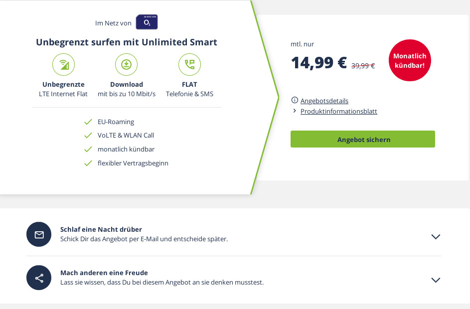 Tariftipp O2 Unlimited Tarife: Unlimited o2 LTE All-In-Flat für 14,99 Euro --520 Euro sparen