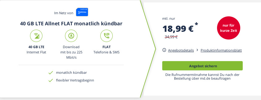 Erinnerung: 40 GB LTE O2 All-In-Flat für mtl. 18,99 Euro und mtl. Laufzeit