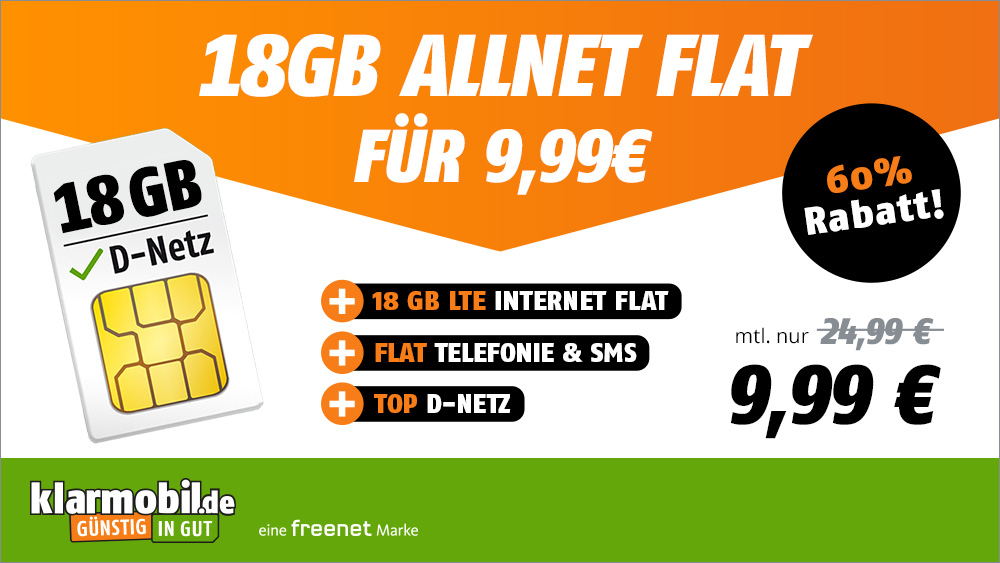 08.04.22 Zum langsamen Start in das Wochenende gibt es für Liebhaber von schnellen LTE Tarifen den 18 GB Allnet-Flat Tarif im Vodafone Netz für unter 10 Euro im Monat. Dieser Tarif kommt ohne Bonus aus, und es werden echte monatliche 9,99 Euro statt 24,99 Euro abgerechnet. Wir zeigen Ihnen -wie immer- alle Features der neuen Vodafone Tarife Aktion auf.