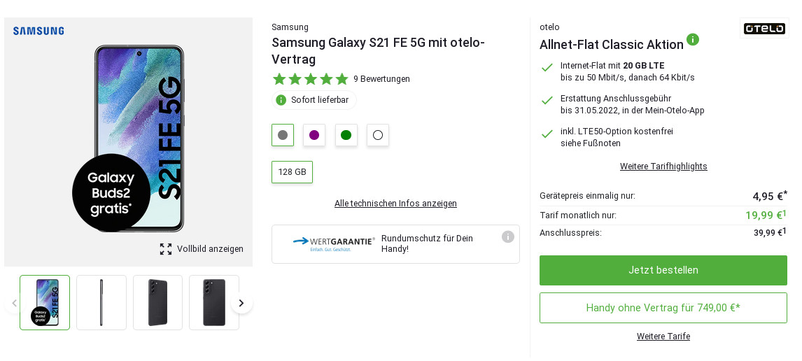 Pfingst-Deal Galaxy S21 FE 5G Tarife: 20 GB Vodafone Allnet-Flat für mtl. 19,99 Euro/Eff. -1,55 Euro