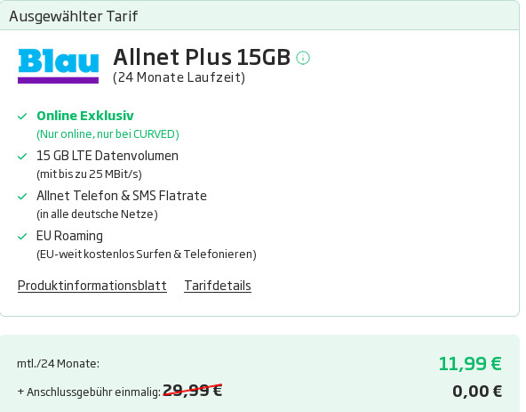 Tariftipp Blau Tarife: Ohne Anschlusspreis --15 GB LTE All-In-Flat für mtl. 11,99 Euro