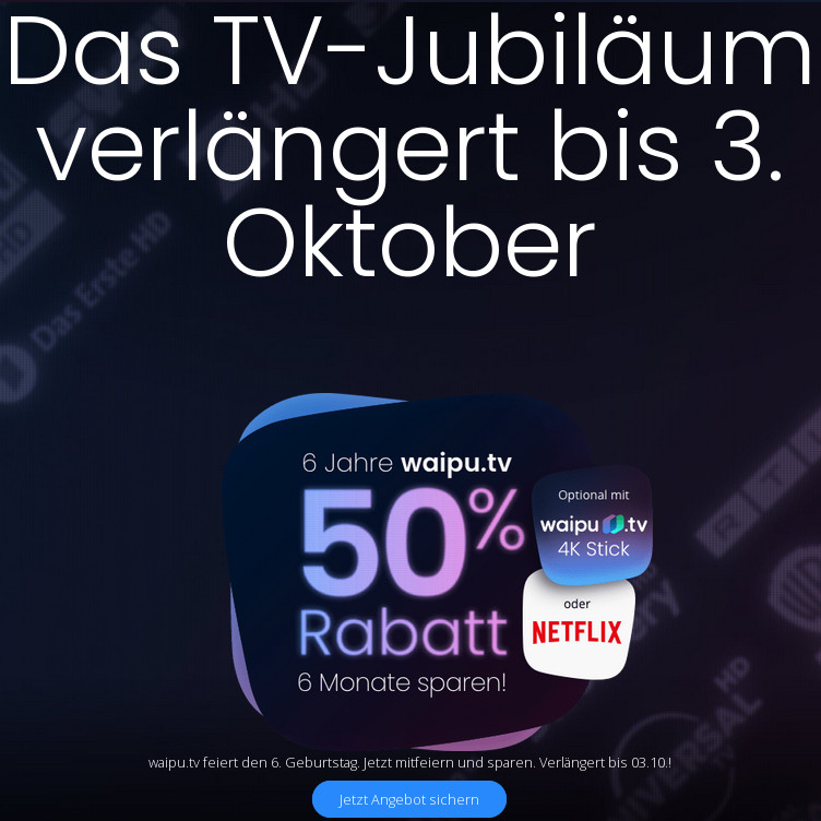 01.10.22 Auch an diesem Wochenende gibt es den IPTV Streaming Dienst Waipu.tv mit einem Rabatt von 50 Prozent. Auch gibt es ein Netflix Abo in Verbindung mit seiner IPTV Plattform WaipuTv an. Durch die neue Partnerschaft kommen Video- und Streaming-Freunde in den Genuss einer Kombination aus IPTV und Video on Demand. Die neue Tarifaktion gilt bis zum kommenden Montag, dem 3.Oktober.