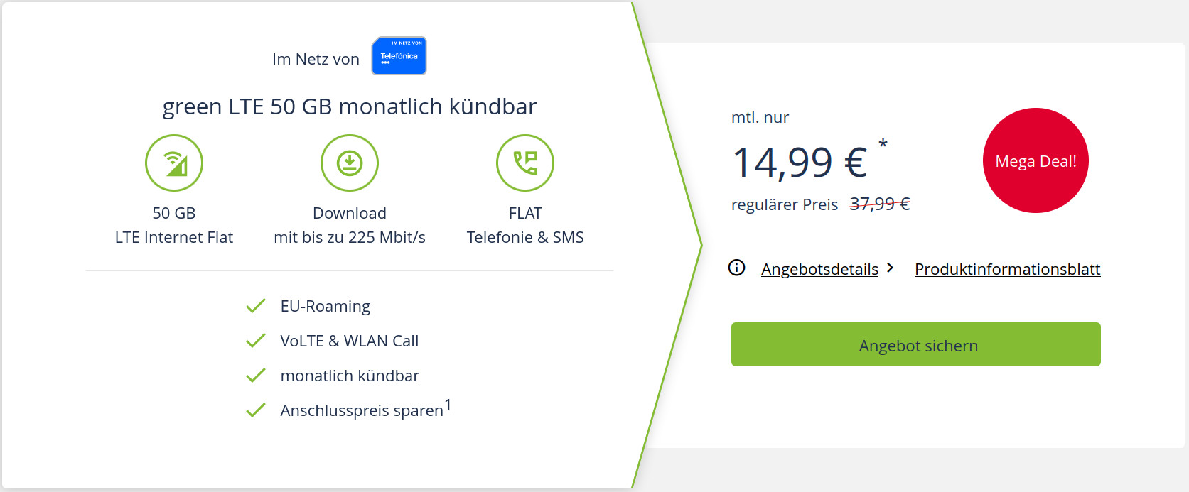 28.10.23 Auch an diesem Wochenende gibt es beim Handydiscounter freenet den 50 GB O2 LTE Tarif mit ordentlichen Rabatten. Damit wird die Aktion von der Wochenmitte verlängert. Dabei gibt es für unsere Leser die freenet 50 GB Telefónica Allnet Flat mit viel Rabatt und Datenvolumen im LTE Netz mit einem 50 GB All-In-Flat Tarif dauerhaft für monatlichen 14,99 Euro statt 37,99 Euro bei einem LTE Speed von 225 Mbit/s im O2 LTE Netz. Auch den Anschlusspreis kann man sparen. Wir zeigen Ihnen -wie immer- alle Einzelheiten der neuen O2 Handytarife Aktion auf.