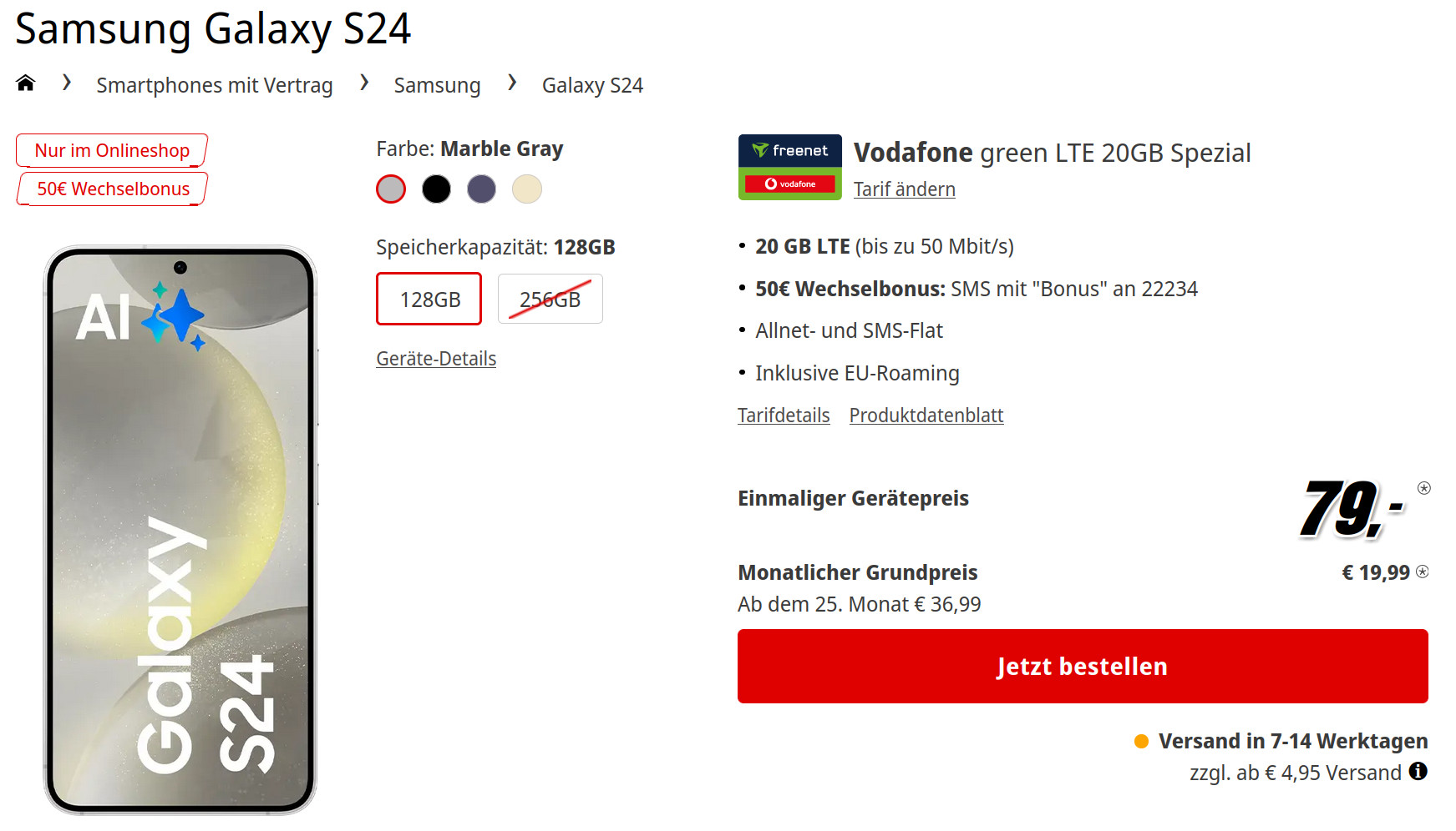 Preishammer Galaxy S24 Tarife: 20 GB Vodafone Allnet-Flat für 19,99 Euro/Eff. -2,14 Euro