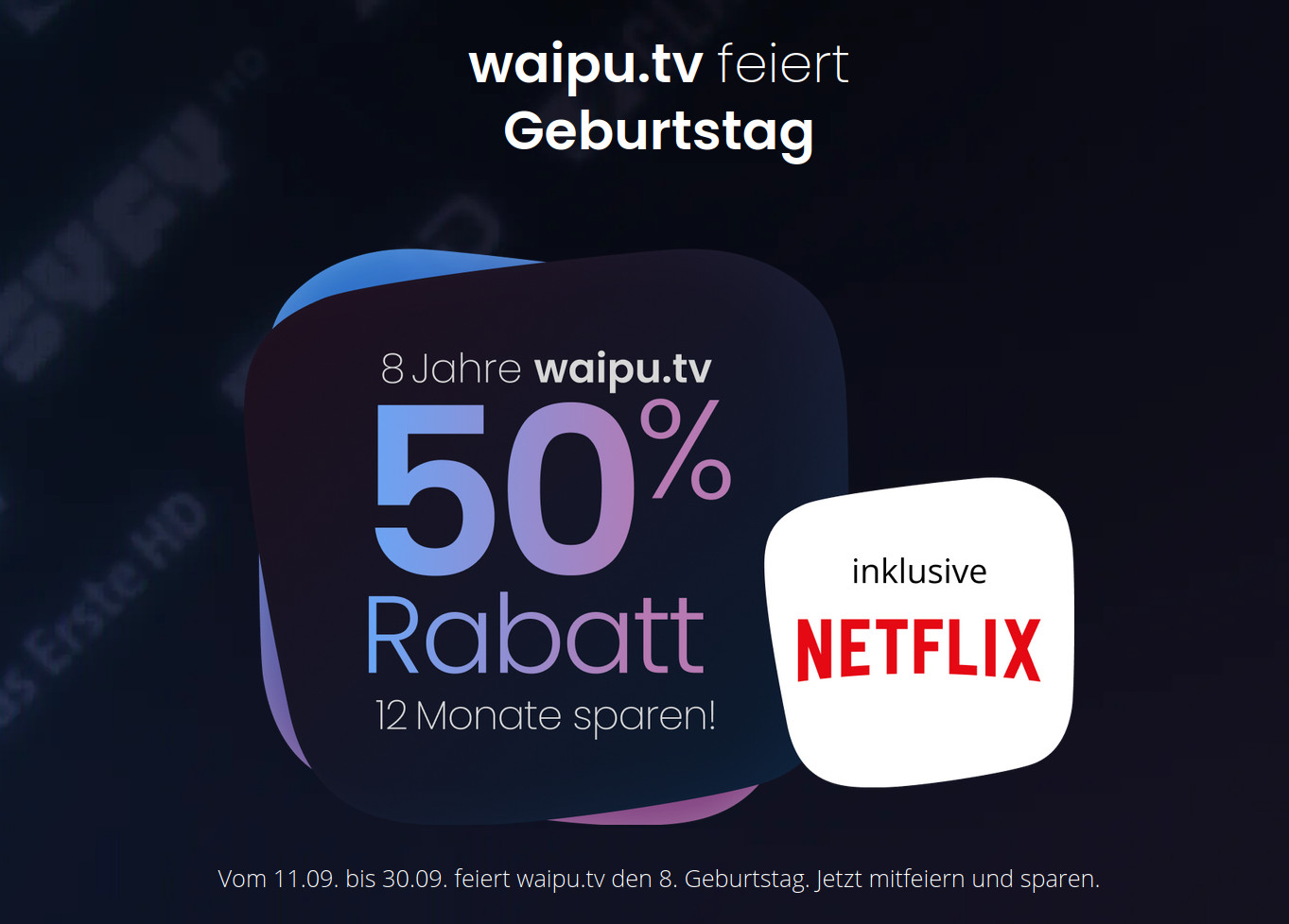 WaipuTV IPTV 50 Prozent --WaipuTV ab 3,74 Euro, mit Netflix ab 8 Euro